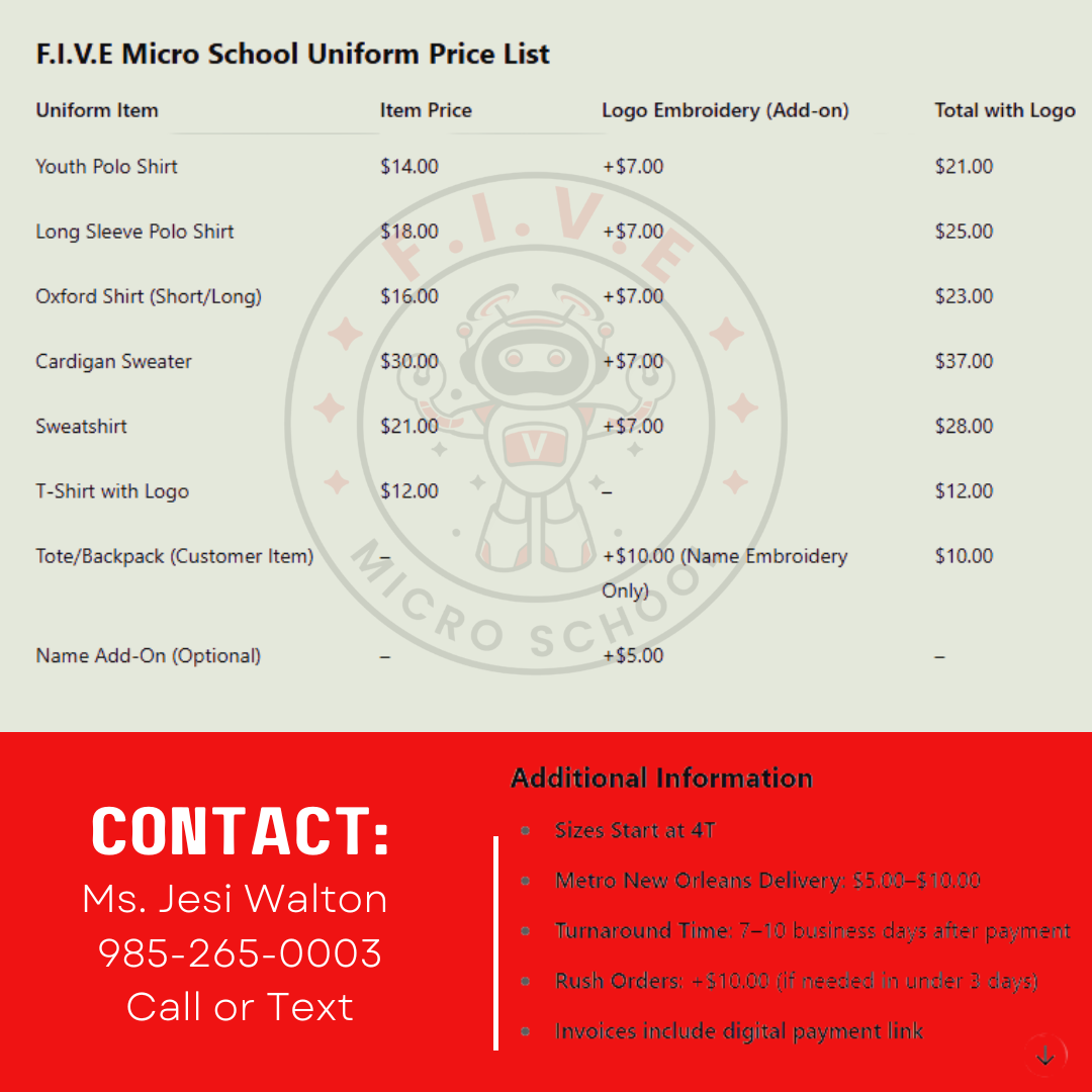 Students are required to wear uniform tops Monday through Thursday. Approved styles include polos, Oxfords, and Peter Pan tops in red, black, or white—each featuring the FIVE Microschool logo on the left side.